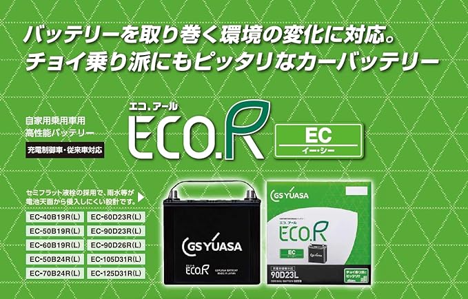 【GSユアサ 2024年モデル】充電制御車対応バッテリー チョイ乗り派に最適!スタンダードバッテリー   ■ 特長 ・クイックチャージ性能130% 短時間充電対応、チョイ乗りOK ・耐サルフェーション性能200% ・高温耐久性能130% ・環境配慮設計(再生樹脂使用) ・セミフラット液栓 ・液入り充電済み   ■ 仕様 メーカー:GSユアサ シリーズ:ECO.R EC STANDARD 型番:EC-40B19L 性能ランク:40 電圧:12V 容量:28Ah 端子位置:L   ■ 適合 充電制御車・通常車・国産車全般 (24B19L、28B19L、36B19L、38B19L、40B19Lから交換可能)   ■ 保証 36ヶ月または6万km ※2024年10月リニューアル